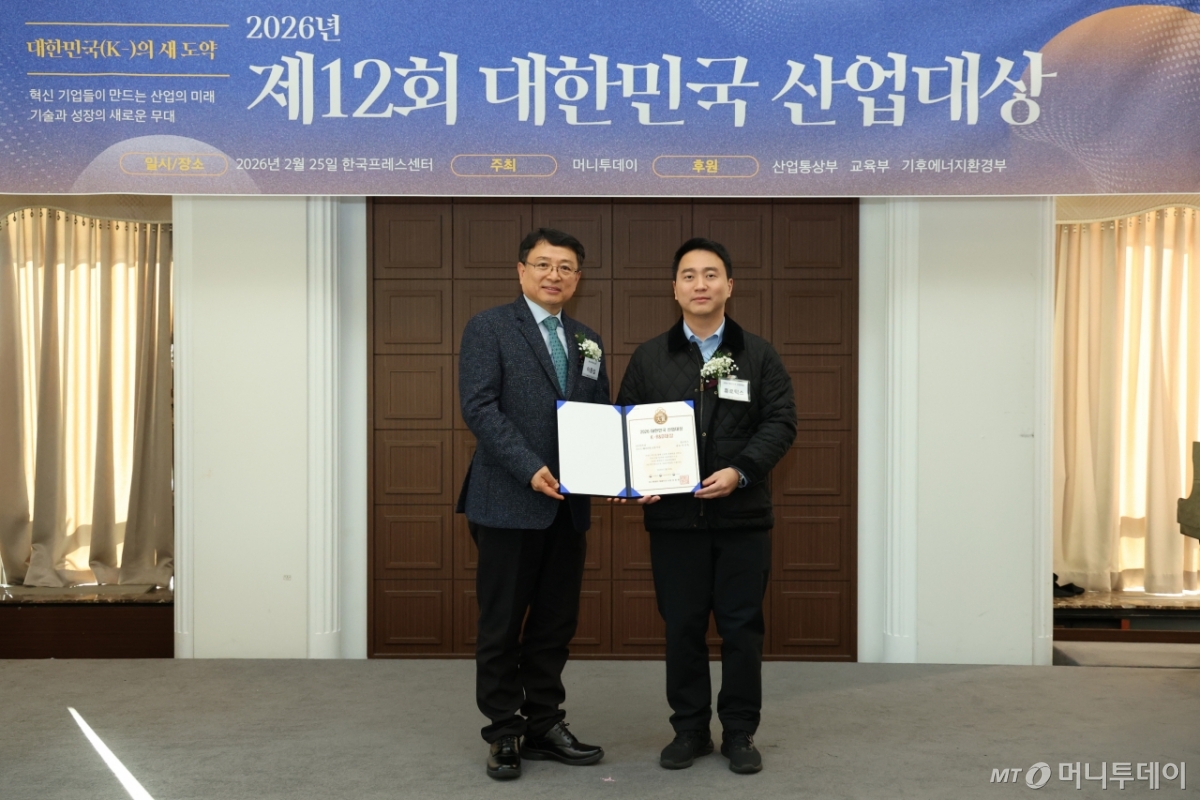 이기욱 휴로틱스 대표(사진 오른쪽)가 25일 오후 서울 중구 한국프레스센터에서 열린 머니투데이 주최의 '2026 제12회 대한민국 산업대상' 시상식에서 4년 연속상으로 '소프트 웨어러블 로봇' 부문 'K-R&D대상'을 수상하고 이종섭 동국대학교 교수와 기념사진을 촬영 중이다.