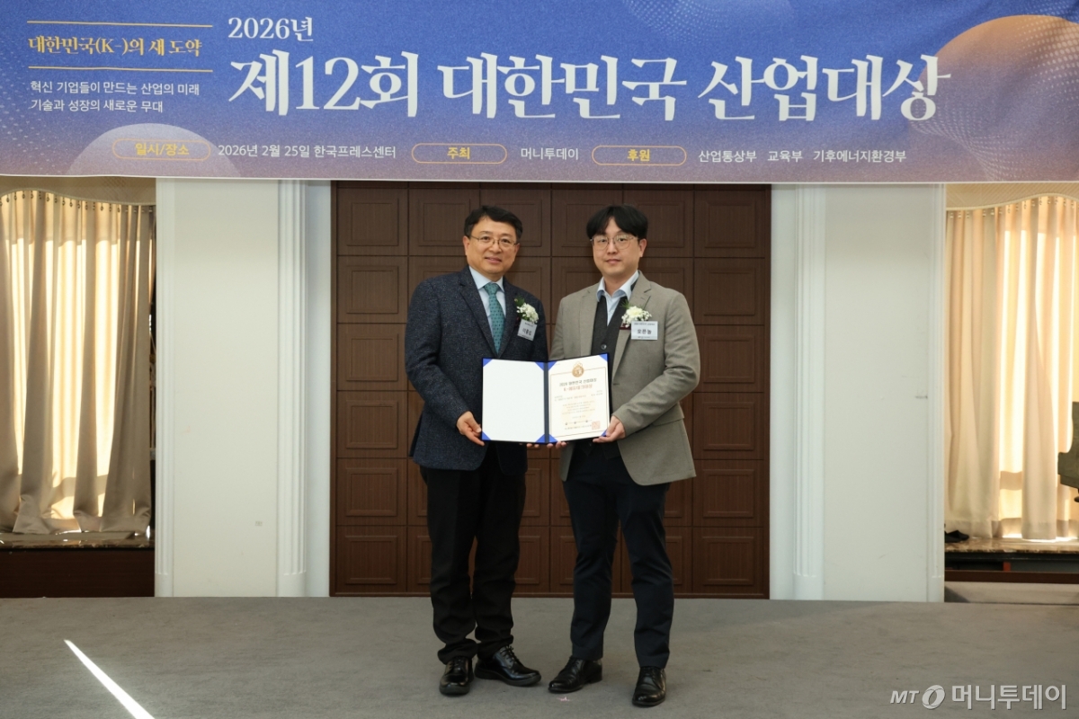 신준수 오픈놀 재무이사(사진 오른쪽)가 25일 오후 서울 중구 한국프레스센터에서 열린 머니투데이 주최의 '2026 제12회 대한민국 산업대상' 시상식에서 4년 연속상으로 'AI·생애주기 기반 취·창업 지원' 부문 'K-에듀테크대상'을 수상하고 이종섭 동국대학교 교수와 기념사진을 촬영 중이다.