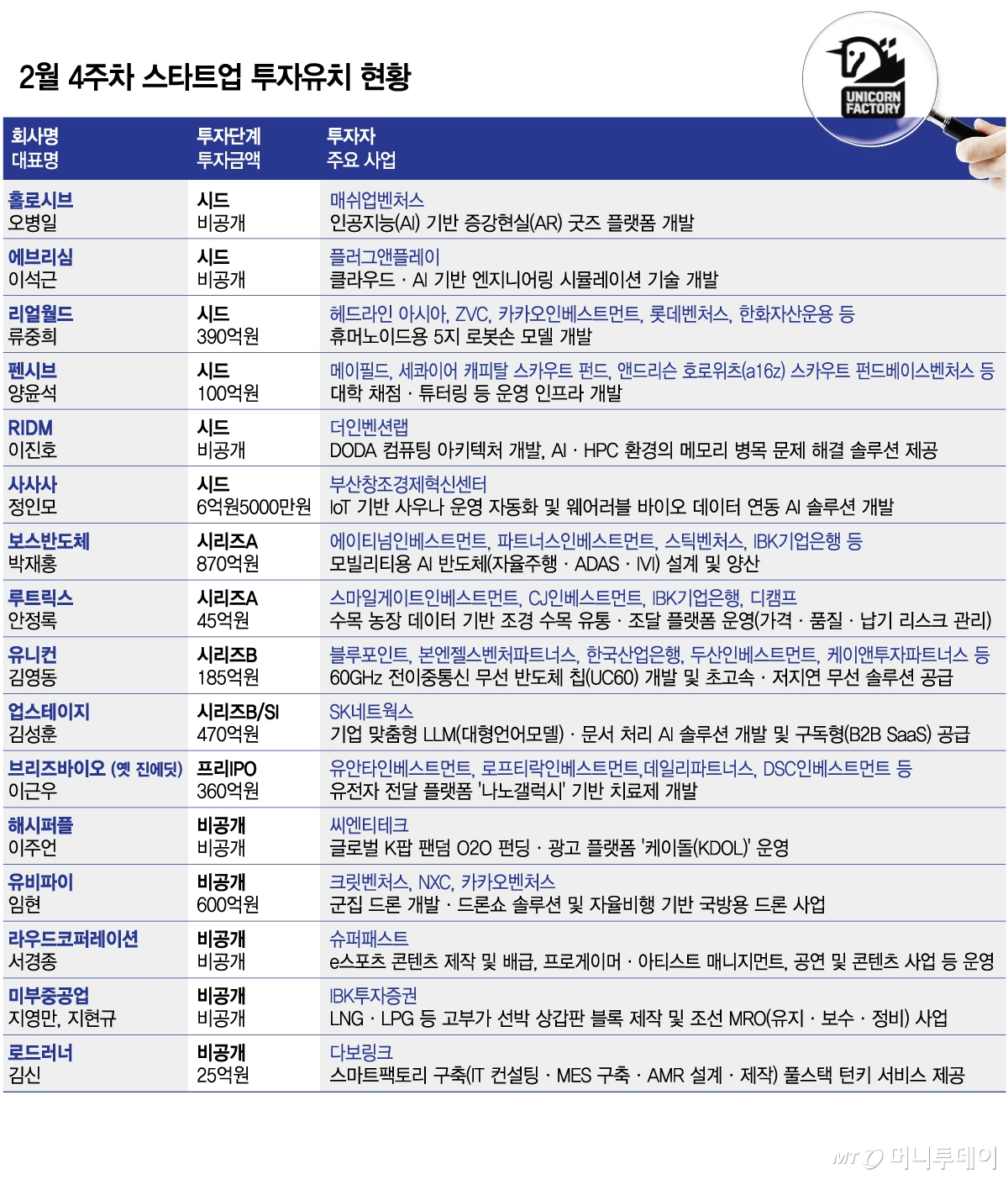 2월 넷째 주(23~27일) 반도체·드론·교육·커머스·엔터테인먼트 등 다양한 분야의 16개 기업이 벤처캐피털(VC)과 액셀러레이터(AC)로부터 투자 유치에 성공했다.