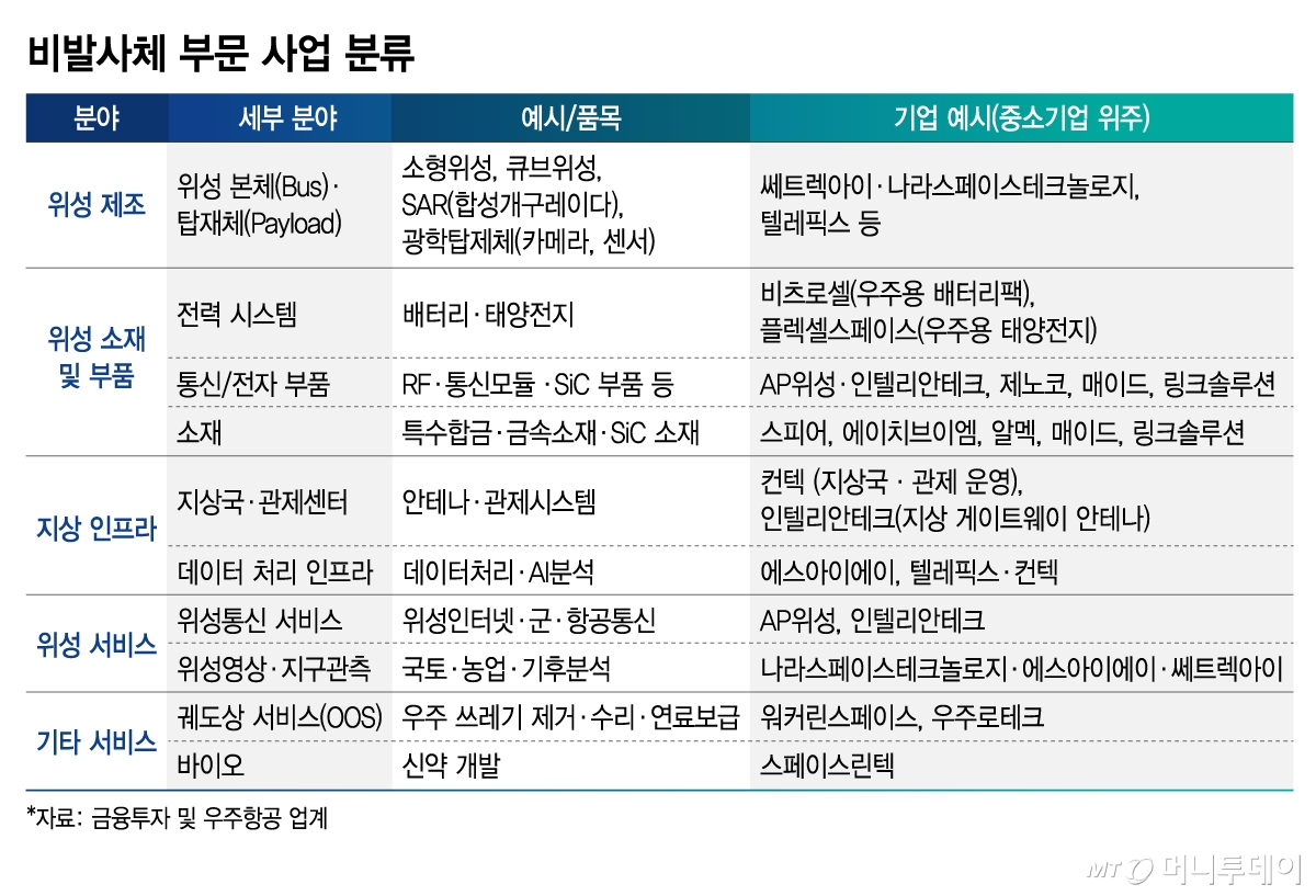 실제 제조 역량을 바탕으로 해외 밸류체인에 편입한 사례도 나오고 있다. 초소형 위성 제작 분야에 강점을 가진 나라스페이스테크놀로지(34,100원 ▼9,200 -21.25%)는 미국의 유인 달 탐사 프로그램인 아르테미스에 투입될 한국 초소형 위성의 본체 제작에 참여했다. 누리호 4차 발사에 들어가는 탑재체 공급 레퍼런스도 보유하고 있다.