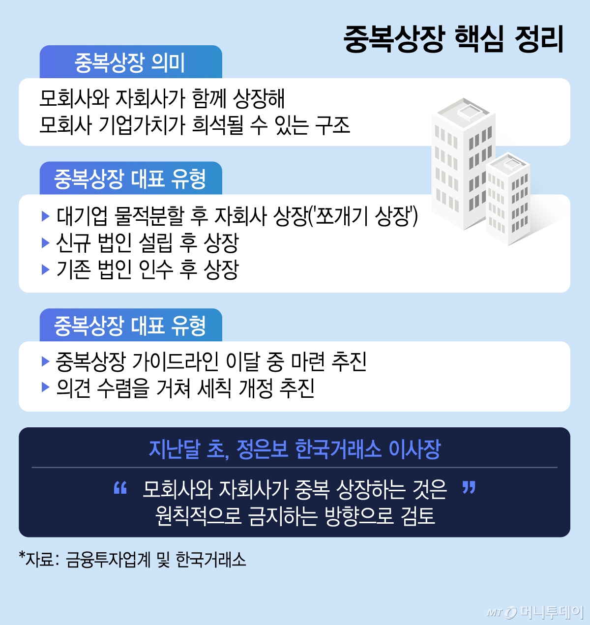 중복상장은 통상 △모회사가 사업부문을 별도 법인으로 물적·인적 분할한 뒤 상장시키는 이른바 '쪼개기 상장' △신규 법인을 설립해 상장하는 경우 △기존 법인을 인수한 뒤 상장시키는 경우 등 유형이 다양하다. 그동안 거래소는 중복상장 여부를 명확한 규정 없이 개별 사안별로 판단했다. 이 때문에 시장에서는 중복상장의 개념과 범위, 허용 기준을 둘러싼 불확실성이 이어져 왔다. 거래소는 시장 참가자의 예측 가능성을 높이기 위해 중복상장 가이드라인 제정에 착수한 상태다. 새로운 기준이 마련되면 업계 의견 수렴과 금융당국 협의를 거쳐 세칙 개정이 추진된다.