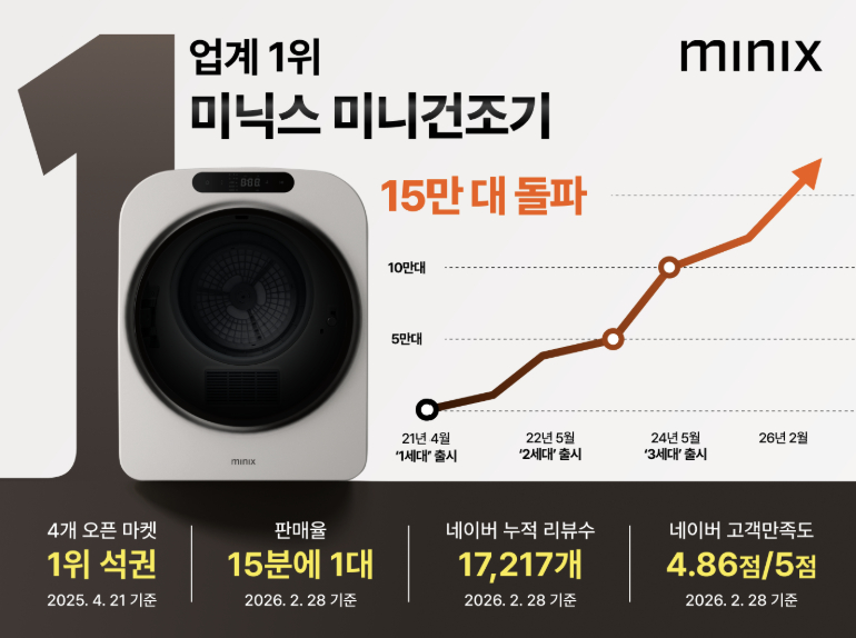 미닉스 브랜드 관계자는 "브랜드 론칭과 함께 선보인 미니건조기가 누적 15만 대를 돌파한 것은 공간 제약에서 비롯된 불편을 해결하려는 브랜드 철학에 고객이 공감한 결과"라며 "앞으로도 성능과 디자인을 모두 갖춘 콤팩트 가전으로 공간의 가능성을 확장하는 새로운 기준을 제시해 나가겠다"고 말했다.