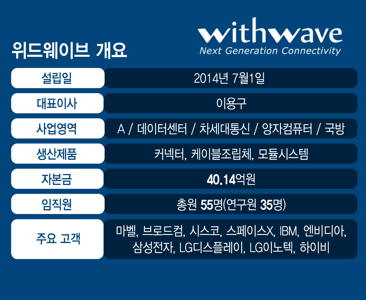 2014년 위드웨이브를 설립한 이용구 대표는 연결 인프라에 대한 중요성을 일찌감치 알아챘다. 삼성전자와 공동으로 56기가비트(Gbps) 초고속 커넥터를 국내 최초로 국산화하고, 세계 최초로 145기가헤르츠(GHz) 동축 커넥터를 상용화할 수 있었던 것도 시장에 대한 선구안이 있었기 때문이다.