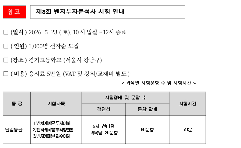 한국벤처캐피탈협회(이하 VC협회)가 지난 3일부터 벤처투자 전문인력 양성을 위한 제 8회 '벤처투자분석사' 자격시험 접수를 시작했다고 밝혔다. 시험은 오는 5월23일 서울 강남구 삼성동 소재 경기고등학교에서 실시된다.
