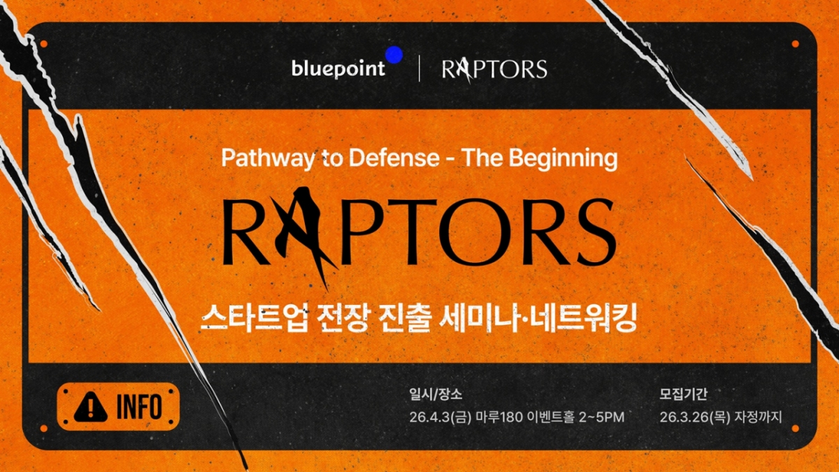 랩터스는 폐쇄적인 방산 생태계를 혁신적인 스타트업과 함께 돌파하겠다는 취지로 기획됐다. 민첩한 육식 공룡 랩터스처럼 발 빠르게 산업 혁신을 이끌겠다는 의미다. 블루포인트는 오는 4월 3일 서울 강남구 역삼로 마루180 이벤트홀에서 첫 행사 '랩터스-더 비기닝(RAPTORS - The Beginning)'을 개최하며 본격적인 활동에 나선다.