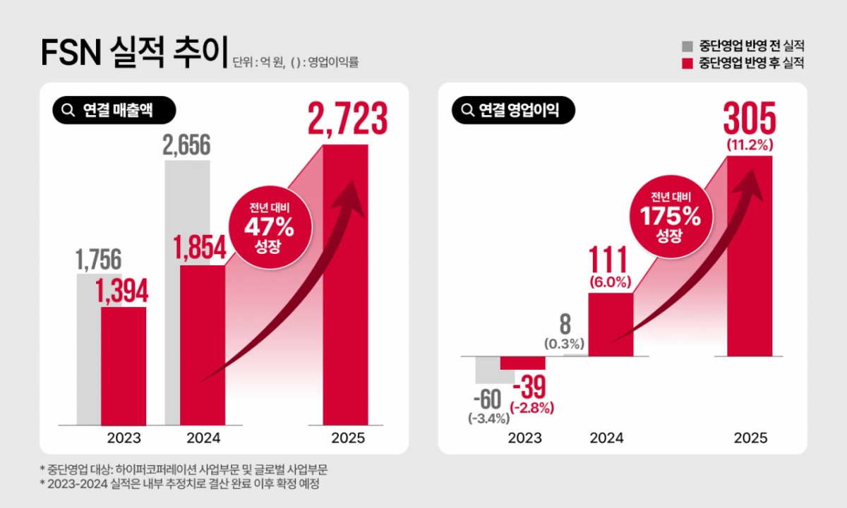 FSN은 지난해 연결 기준 연간 매출액 2723억원, 영업이익 305억원을 기록했다. 이는 중단영업 반영 기준 전년 대비 각각 47%, 175% 증가한 수치다.