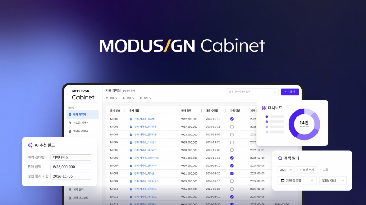 이러한 비전을 담은 제품이 지난해 말 출시한 '모두싸인 캐비닛(Cabinet)'이다. 이 제품은 AI가 계약서의 제목, 상대방, 날짜, 금액 등을 자동 분류하고 핵심 정보를 추출하는 지능형 솔루션이다.