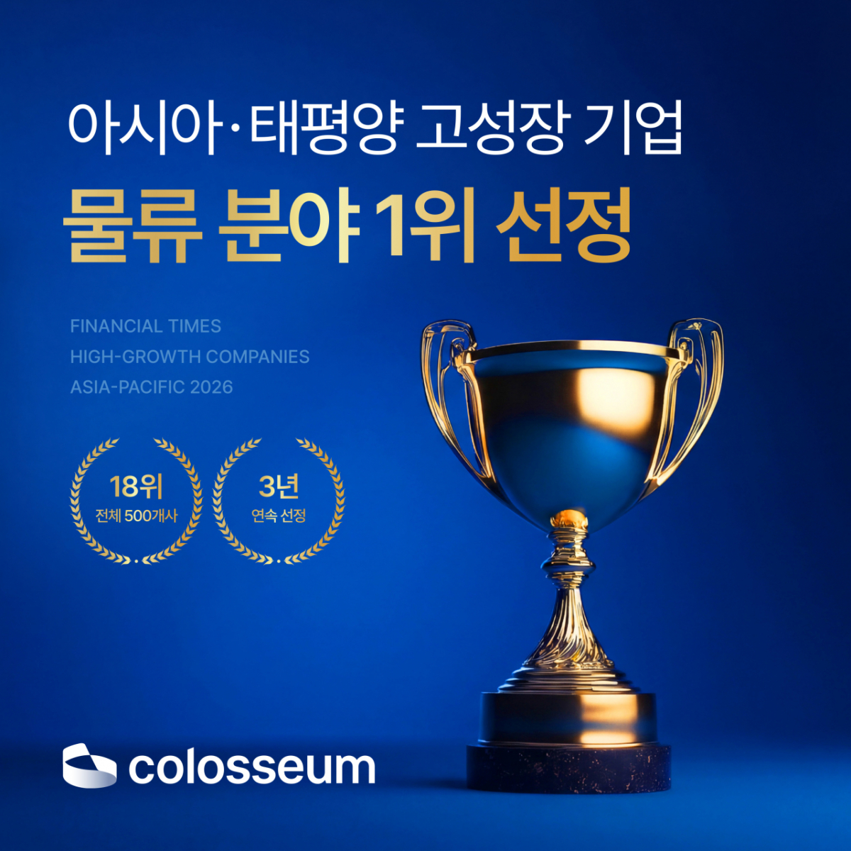 글로벌 물류 DX(디지털전환) 전문기업 콜로세움코퍼레이션(이하 콜로세움)이 영국 경제지 파이낸셜타임스(FT)와 글로벌 리서치 기관 스태티스타가 발표한 '2026 아시아·태평양 고성장 기업'에 3년 연속 선정됐다고 31일 밝혔다. 물류 분야에서는 1위에 선정됐으며, 전체 500개 기업 가운데서는 18위에 올랐다.