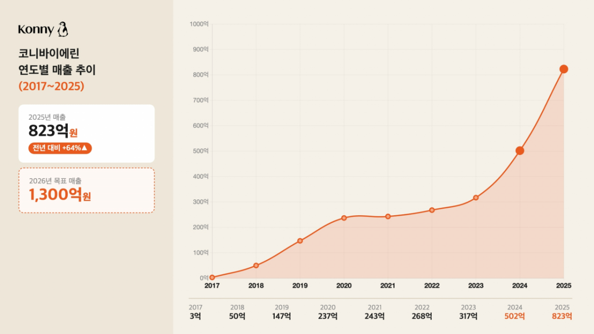 이날 회사에 따르면 지난해 연매출은 전년 대비 64% 증가한 823억원을 기록했다. 2024년에 이어 2년 연속 60%대 성장률이다. 이는 국내 합계출산율이 1명 미만에 머무는 저출산 국면 속에서 국내 육아 브랜드들이 고전하는 가운데 거둔 성과다.
