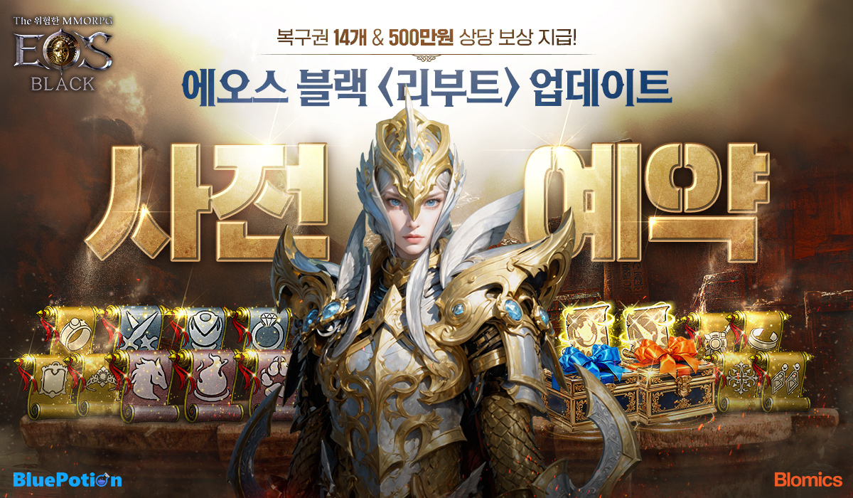 블로믹스는 블루포션게임즈와 공동 서비스하는 모바일 MMORPG(대규모다중접속역할수행게임) '에오스 블랙'이 오는 23일 진행되는 '리부트' 업데이트를 앞두고 사전예약을 시작한다고 2일 밝혔다.