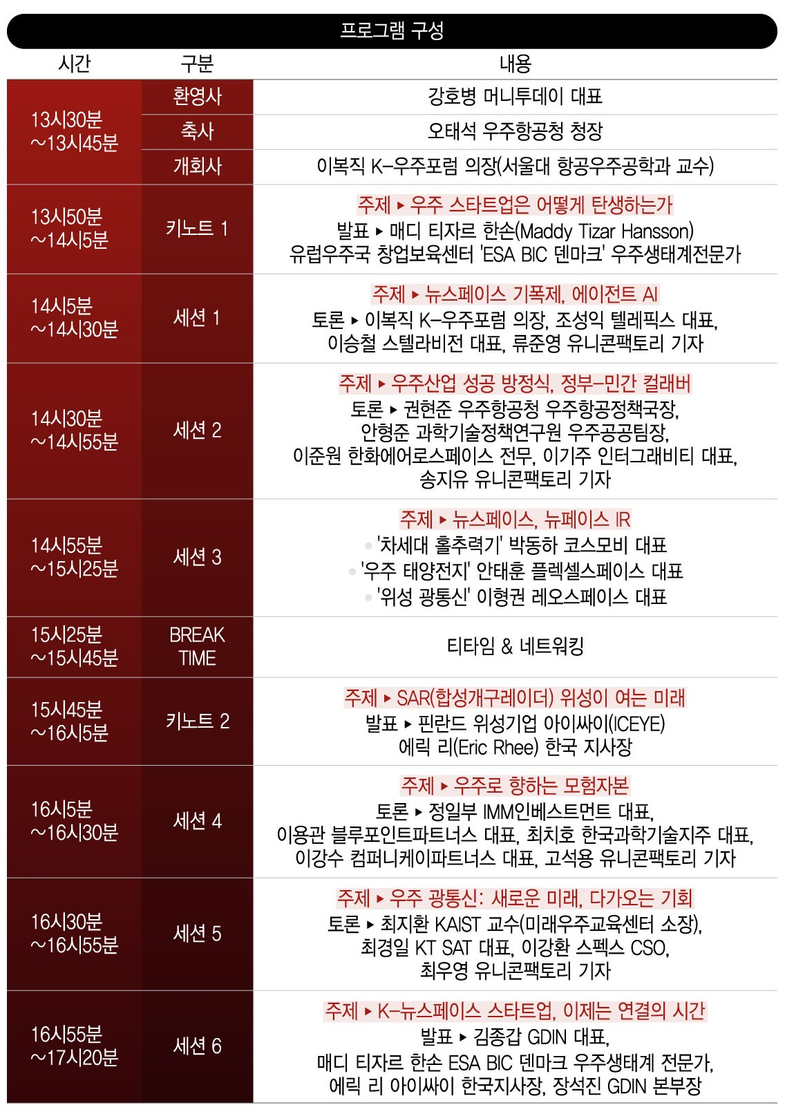 이번 세션에는 이복직 K-우주포럼 의장(서울대 항공우주공학과 교수)을 비롯해 위성 데이터를 활용해 산업 문제를 해결하는 국내 대표 우주 스타트업 텔레픽스의 조성익 대표와 스텔라비전의 이승철 대표가 참여한다. 세 사람은 '뉴스페이스 기폭제, 에이전트 AI'를 주제로, 우주 산업이 어떻게 달라지고 있는지를 설명할 예정이다.<☞참여신청 클릭>