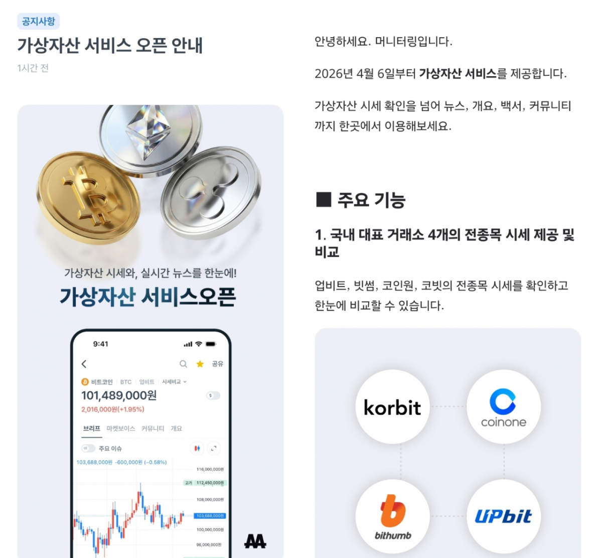 이를 통해 머니터링 이용자들은 △거래소별 시세 통합 비교 △종목 개요 및 백서 확인 △실시간 관련 뉴스 및 커뮤니티 연결 등 심층 정보를 단일 화면에서 원스톱으로 확인할 수 있다. 분산된 정보를 통합 제공함으로써 투자자의 탐색 효율과 편의성을 높였다는 설명이다.