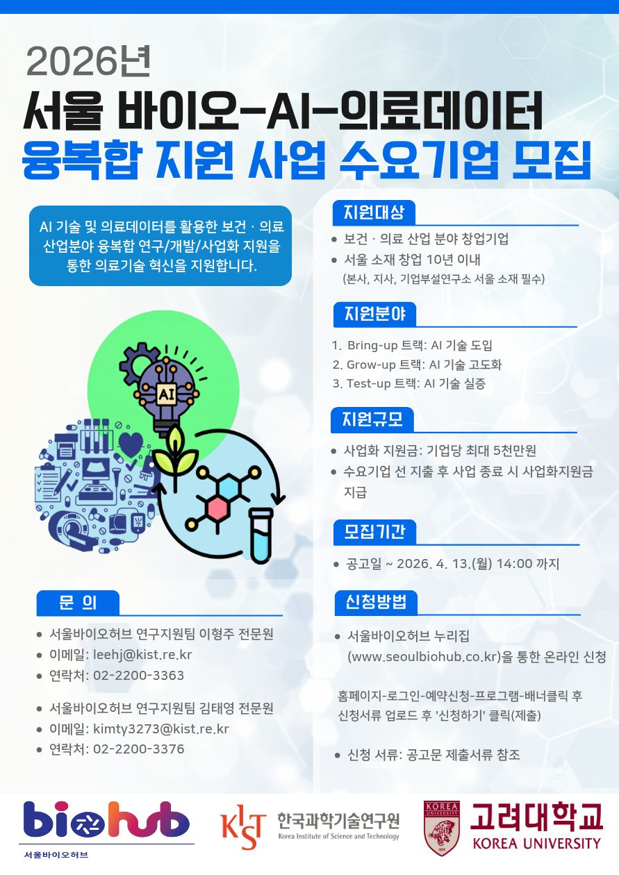 서울시가 조성하고 한국과학기술연구원(KIST)과 고려대학교가 운영하는 바이오·의료 창업 지원 거점인 '서울바이오허브'가 보건·의료 스타트업의 디지털 전환(DX)과 기술 혁신을 위해 '서울 바이오-AI-의료 데이터 융복합 지원 사업' 참여 기업을 모집한다고 8일 밝혔다.