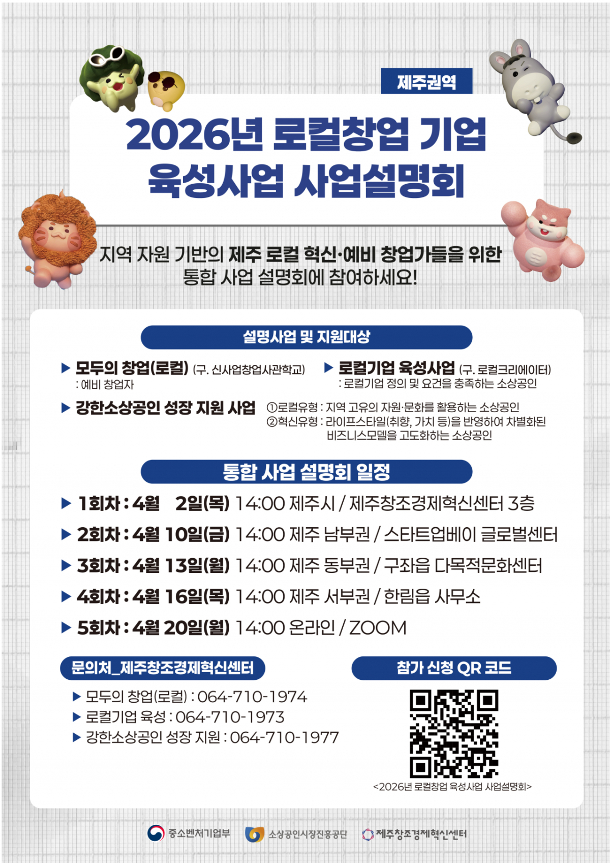 설명회는 총 5회에 걸쳐 진행된다. 지난 2일 제주창경센터를 시작으로 △오는 10일 서귀포시 스타트업 베이 글로벌센터 △오는 13일 구좌읍 다목적문화센터 △오는 16일 한림읍사무소 △오는 20일 온라인(줌)으로 운영될 예정이다. 제주 지역을 순회하는 방식으로 진행된다.