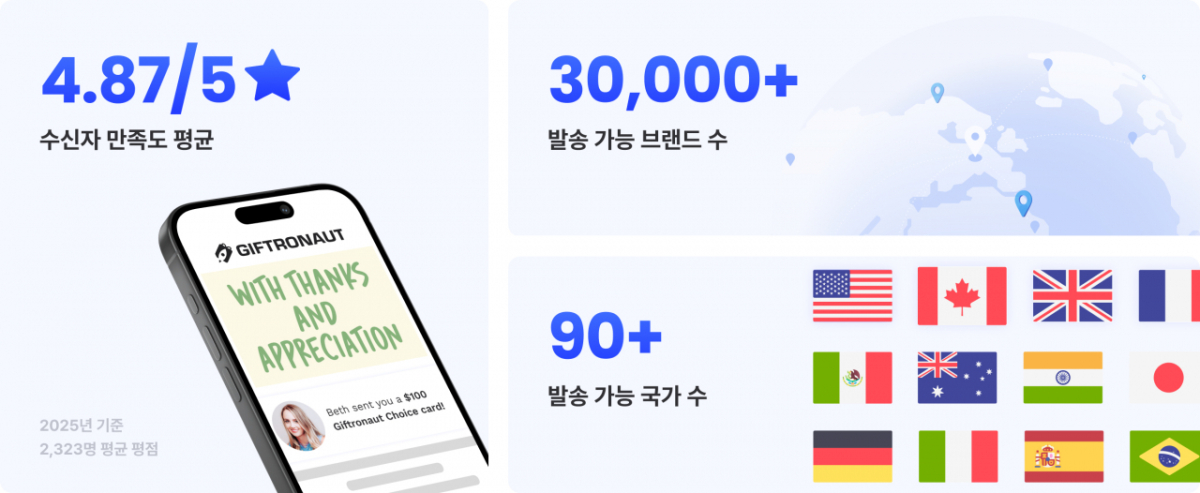 기프트로넛은 이러한 문제를 해결하기 위해 개발됐다. 국가·통화·브랜드를 아우르는 기프트카드 상품과 대량 발송 자동화 시스템을 하나의 서비스로 통합 제공한다. 기업은 별도의 현지 계약이나 복잡한 운영 없이 해외 임직원과 고객에게 디지털 기프트카드를 발송할 수 있다.