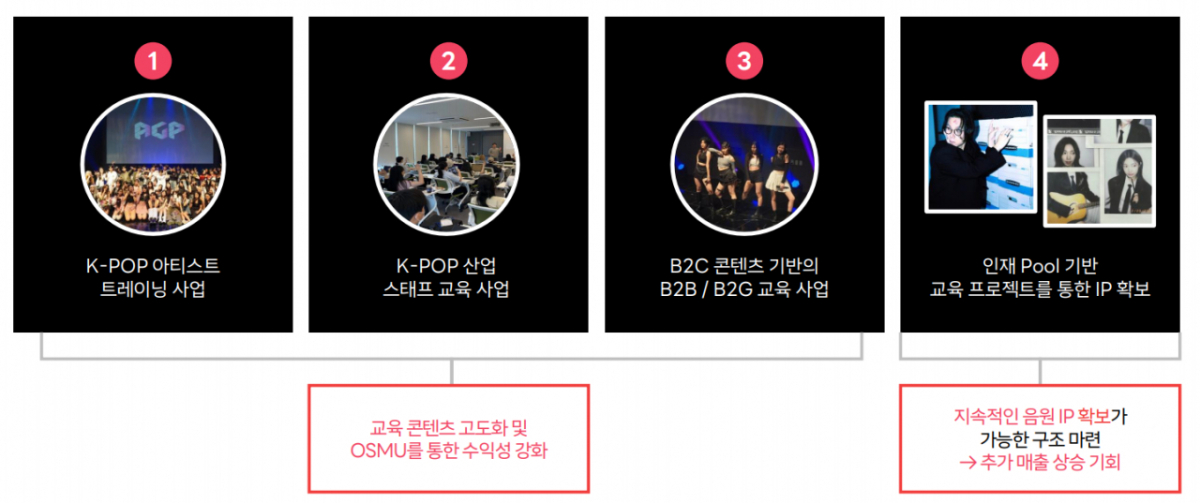 특히 중국의 대형 유통 총판 등 현지 파트너와의 협업을 통해 K팝 교육 콘텐츠의 가맹 모델 판매도 계획하고 있다. 이를 통해 지속가능하면서도 건강한 K팝 생태계를 조성한다는 목표다.