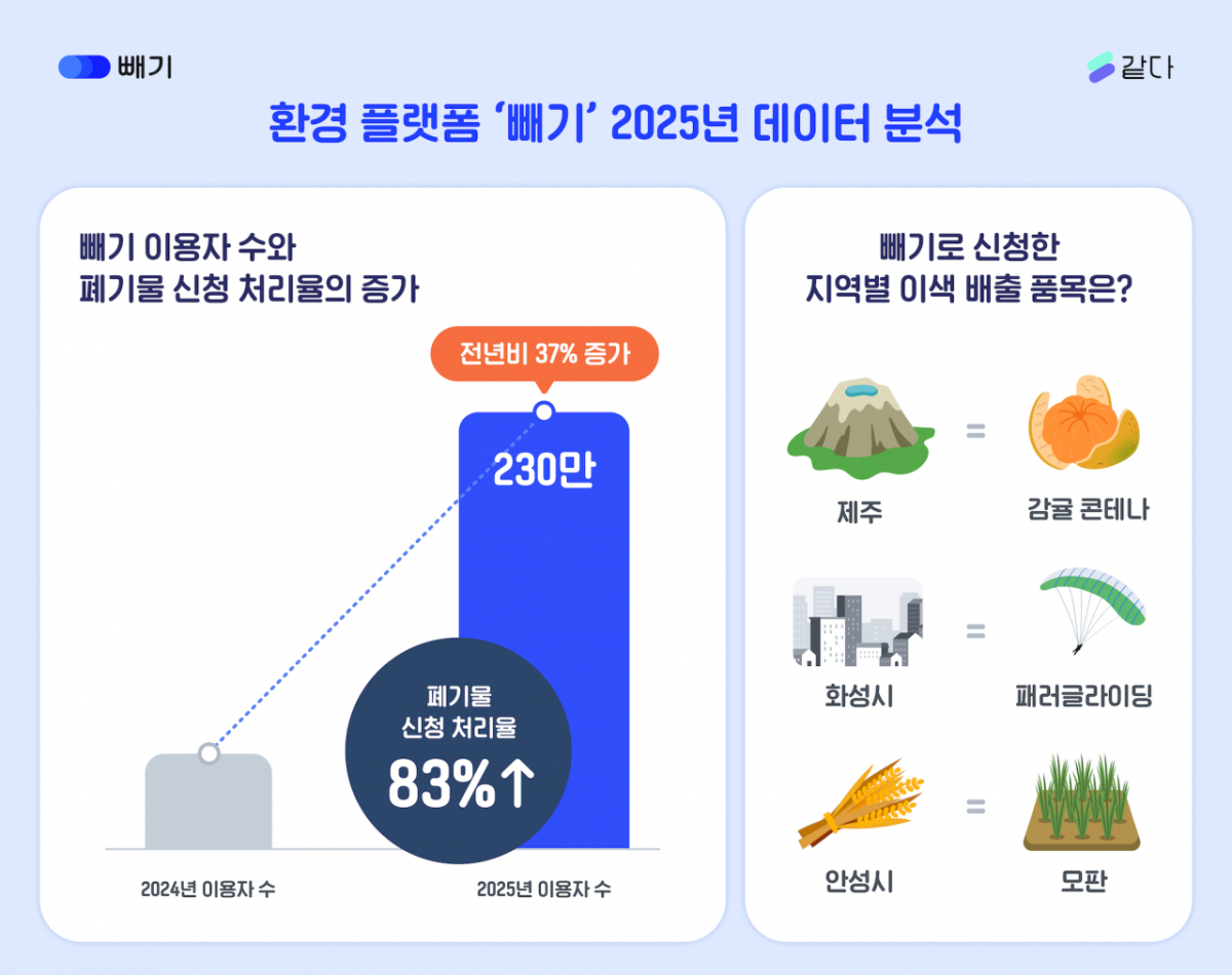같다의 주력 서비스인 빼기는 파편화된 폐기물 배출·처리 과정을 데이터로 통합해 지방자치단체의 행정 효율을 극대화하는 동시에 개인의 편의성을 높여준다. AI를 통해 제각각인 폐기물 품목을 행정 규격으로 자동 매핑하는 기술력을 갖췄다.