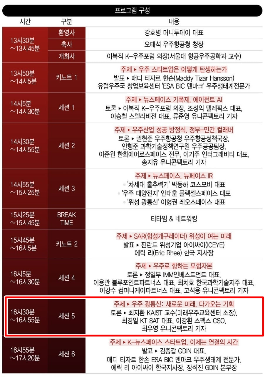 패널에 최지환 KAIST 우주항공공학과 교수, 최경일 KT SAT 대표, 이강환 스펙스 CSO