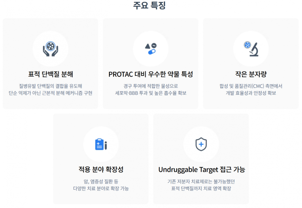분자접착제 기반 항체-약물접합체(ADC)를 비롯해 분자접착제 단독 기전을 활용한 신약 개발을 동시에 추진하고 있다. 현재 다발성골수종(Multiple Myeloma, MM)을 주요 적응증으로 하는 항암 후보물질을 도출 중이다.