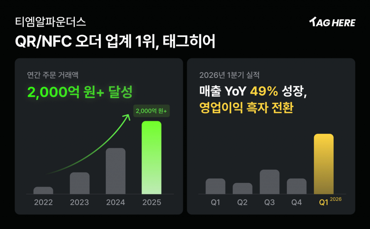 NFC(근거리 무선통신)테이블 오더 '태그히어'를 개발한 스타트업 티엠알파운더스가 올해 1분기 매출이 전년 동기 대비 49% 늘어나며 흑자전환에 성공했다고 15일 밝혔다. 지난해 연간 주문 거래액은 2000억원을 돌파했다.