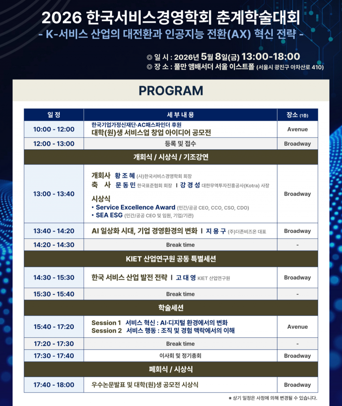 이번 학술대회는 'K-서비스 산업의 대전환과 인공지능 전환(AX) 혁신 전략'을 주제로 열린다. 디지털 전환(DX)을 넘어 인공지능 전환(AX) 시대로 재편되는 글로벌 서비스 산업 환경 속에서, 대한민국 서비스 산업의 경쟁력을 재정립하고 미래 성장 전략을 모색하기 위한 자리다.