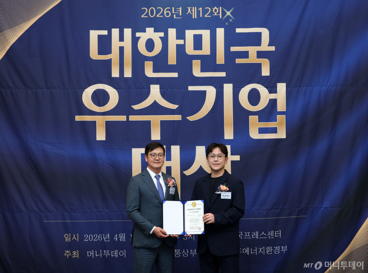 신현일 마크버스 대표(사진 오른쪽)가 16일 오후 서울 중구 한국프레스센터에서 열린 머니투데이 주최의 '2026 제12회 대한민국 우수기업대상' 시상식에서 '데일리케어 커머스' 부문 '우수스타트업대상'을 수상하고 송기용 머니투데이 전무와 기념사진을 촬영 중이다.