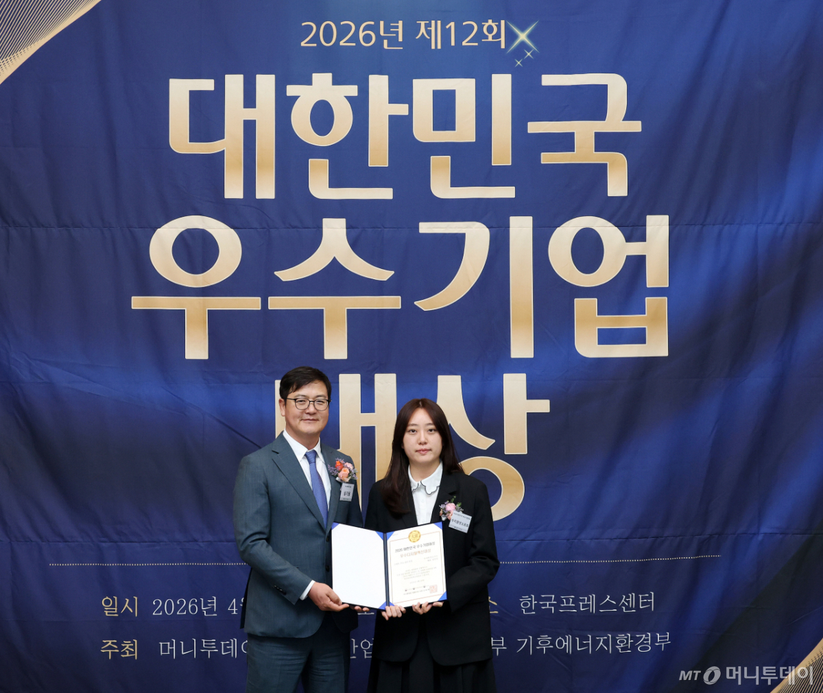정영지 수지원넷소프트 팀장(사진 오른쪽)이 16일 오후 서울 중구 한국프레스센터에서 열린 머니투데이 주최의 '2026 제12회 대한민국 우수기업대상' 시상식에서 '스마트 주소 관리' 부문 '우수디지털혁신대상'을 수상하고 송기용 머니투데이 전무와 기념사진을 촬영 중이다.