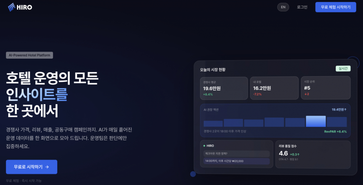 호텔 운영 자동화를 지원하는 히로는 먀 기반의 호텔 인텔리전스 플랫폼이다. AI가 매일 운영 데이터를 분석해 가격 전략, 리뷰 관리, 매출 최적화 등 핵심 업무에 대한 인사이트를 제공함으로써 운영 효율을 높이고 데이터 기반 의사결정을 가능하게 한다.