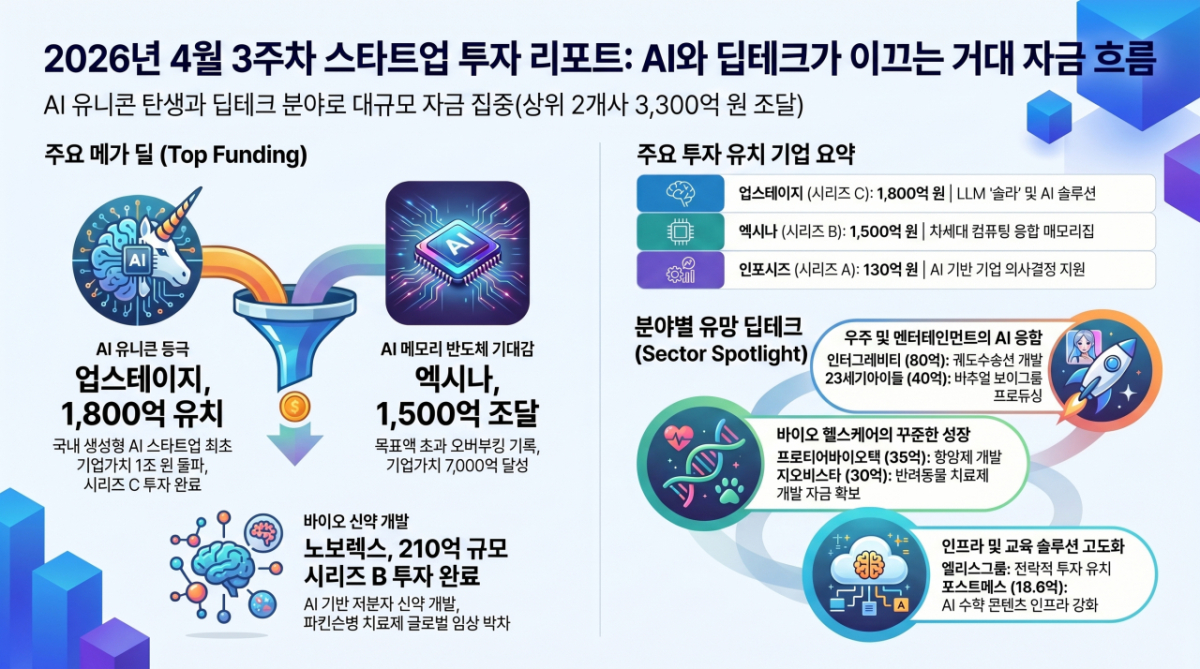 4월 3주차(13~17일) 국내 스타트업 업계는 대규모 투자유치 소식이 잇따랐다. 생성형 AI(인공지능)와 반도체, 바이오 등 기술 집약 분야로 자금이 쏠렸고 메가딜(100억원 이상의 투자유치)부터부터 수십억원 규모의 시드투자까지 다양한 스펙트럼을 보였다.