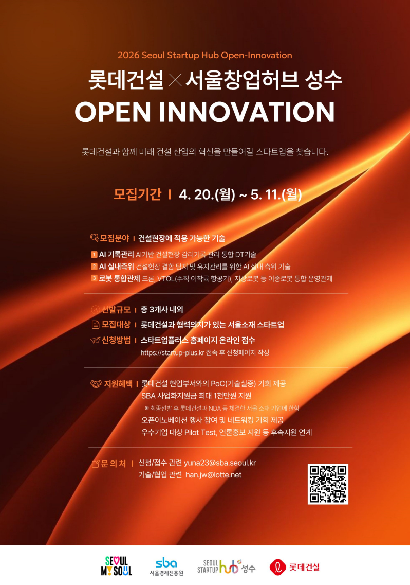 서울시와 서울경제진흥원(SBA)이 운영하는 우수 스타트업 지원시설 '서울창업허브 성수'가 롯데건설과 협력해 건설 현장에 적용 가능한 혁신 기술을 보유한 스타트업을 오는 5월 11일까지 모집한다고 20일 밝혔다.