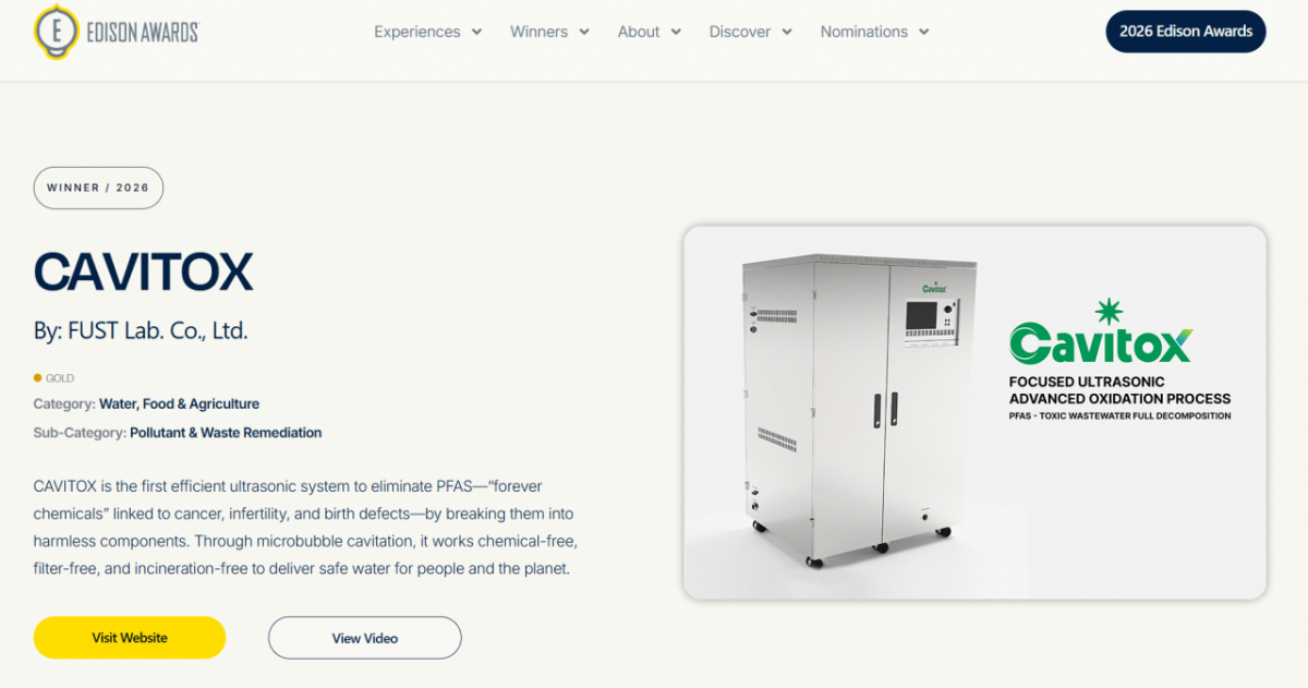 퍼스트랩은 집속형 초음파를 활용한 수질오염물질 처리 솔루션 '캐비톡스(CAVITOX)'로 금상을 수상했다. 특히 영원히 분해되지 않는 화학물질로 불리는 물속 PFAS(과불화화합물)를 분자 수준에서 파괴하는 접근 방식으로 심사위원들의 지지를 받았다.
