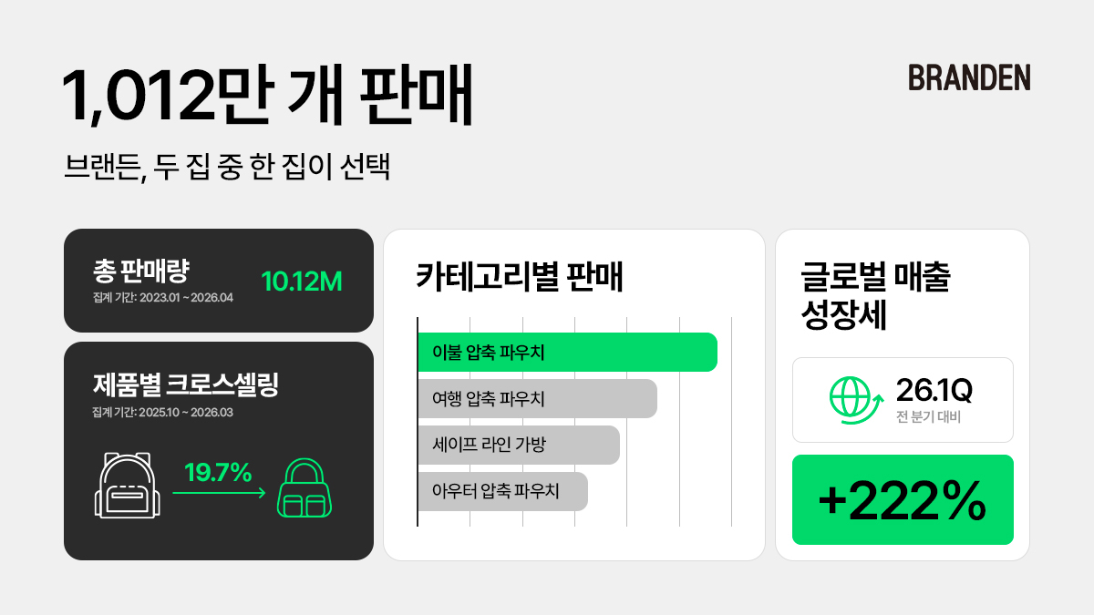 브랜든은 이불과 계절 의류 등 부피가 큰 짐을 손상 없이 줄여주는 압축 파우치를 중심으로 성장해 왔다. 이후 여행 압축 파우치와 아우터 압축 파우치, 기능성 여행 가방 등으로 제품군을 확장하며 일상과 여행 전반의 정리 수요를 공략하고 있다.