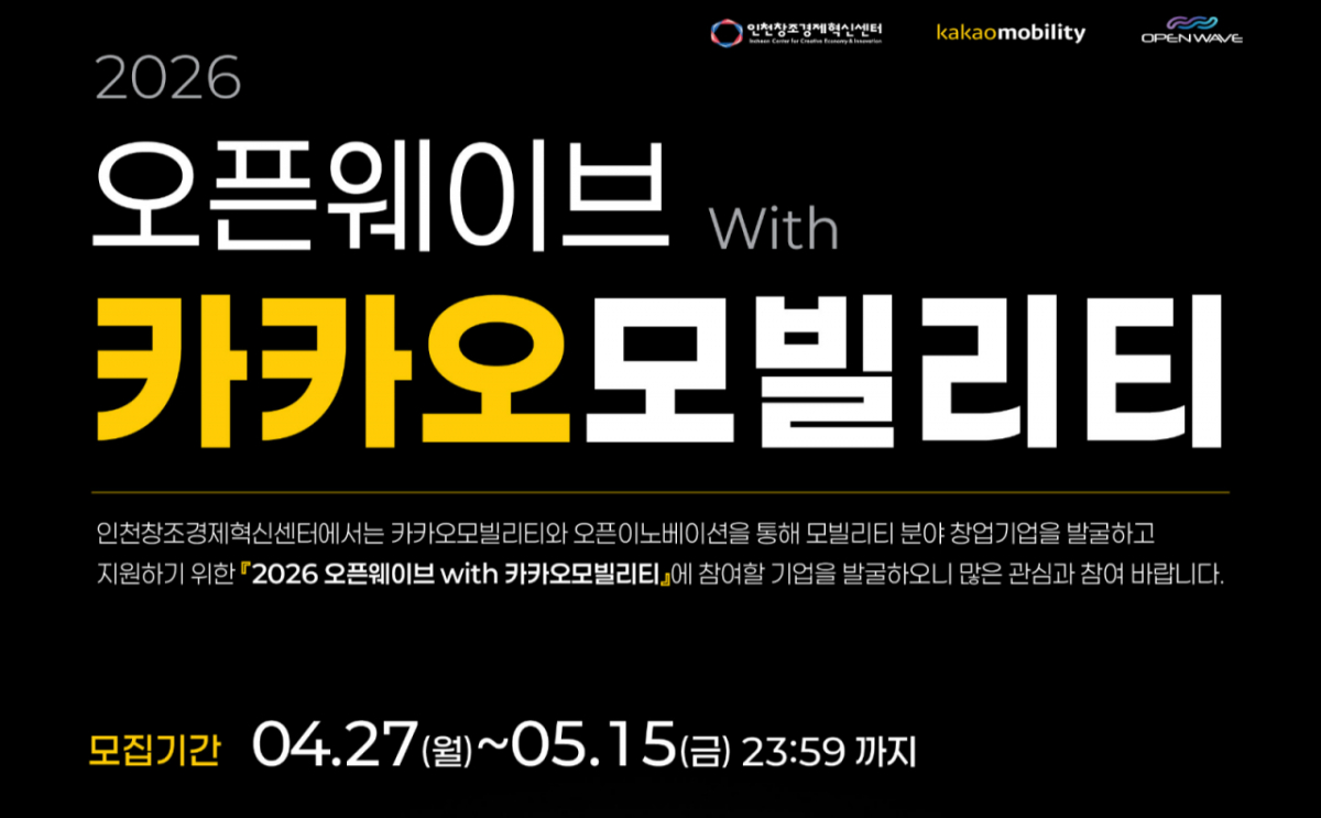 인천창조경제혁신센터(인천혁신센터)가 카카오모빌리티와 함께 모빌리티 분야 창업기업을 발굴·지원하는 오픈이노베이션 프로그램 '2026 오픈웨이브 with 카카오모빌리티' 참여기업을 모집한다고 28일 밝혔다.