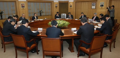 사진 왼쪽부터 박용현 두산 회장, 박영주 이건산업 회장, 박삼구 금호아시아나 회장, 조석래 전경련 회장, 조양호 한진그룹 회장, 현재현 동양 회장, 최용권 삼환기업 회장, 신동빈 롯데 부회장, 김윤 삼양사 회장, 류진 풍산 회장, 이윤호 전경련 상근부회장.(아래 사진은 참석자들이 원탁에서 회의를 진행하는 모습)