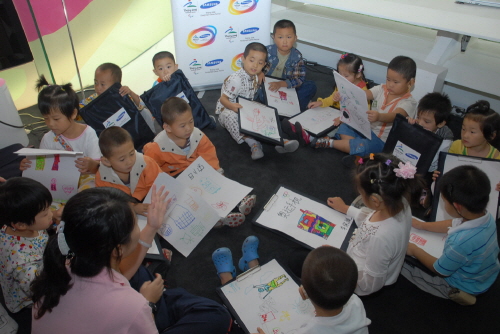 장애인올림픽 무선통신분야 공식 후원사인삼성전자(219,500원 ▼5,000 -2.23%)가 9일 중국 농아회복연구센터의 청각장애 어린이 20여명을 삼성전자 홍보관으로 초청, '내가 갖고 싶은 미래의 휴대폰'을 주제로 한 그림 그리기 대회를 개최했다.