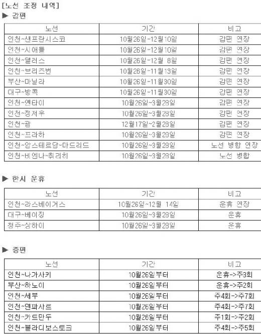 이에 따라 대한항공은 동계스케줄 기간(2008년10월26일~2009년 3월28일) 중 인천 ~샌프란시스코(10월26일~12월10일), 인천~브리즈번(10월26일~11월 13일) 등 수요가 극히 부진한 12개 노선에 대해 9, 10월에 이어 감편 또는 노선 병합을 연장한다. 또 인천~라스베이거스(10월26일~12월14일) 노선 등 3개 노선도 9, 10월에 이어 운휴를 연장하거나 운휴하기로 했다.