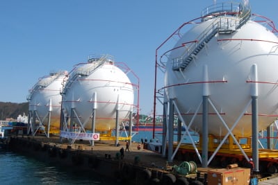 대한통운(104,100원 ▼1,200 -1.14%)은 9일 국내 최초로 대형 부탄가스 저장용 구형 탱크를 운송하는데 성공했다고 밝혔다.
