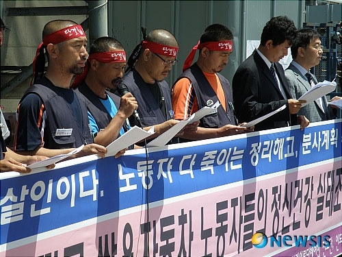11일 오전 경기 평택시 칠괴동 쌍용자동차 평택공장내에서 쌍용차 노조원들과 임상혁 노동환경건강연구소장, 백남순 인도주의실현의사협의회 사무국장 등이 쌍용차 노조원들의 정신건강 및 건강검진 결과를 발표하고 있다. 독자들의 PICK! 홍서범·조갑경, '아들 불륜' 사과…"양육비·위자료 빨리 주도록 할 것" 이휘재 "복귀 중압감에 가위 눌려…실수 잘 알아, 미흡하고 모자랐다" 홍지윤 "식당서 내 앞담화 하더라…충격에 무대공포증" 이하이 "도끼, 하나뿐인 내 남자" 열애 인정…"두 사람 지금 미국에"