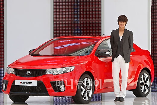 기아자동차가 11일 오전 서울 삼성동 코엑스 야외광장에서 '포르테 쿱(FORTE KOUP)' 신차발표회를 갖고 있다. 홍보대사인 탤런트 김범이 1호차 주인공으로 선정되어 포즈를 취하고 있다.
