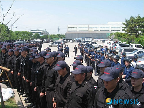 쌍용자동차가 고용한 M경비용역업체 경비원들과 경찰이 23일 오전 쌍용차 경기 평택공장 정문 옆 주차장을 사이에 두고 배치돼 있다. 경찰은 이날 출근투쟁에 나선 직원들의 공장진입을 차단하고 있으며 경비원들은 외부인들의 출입을 막고 있다. 독자들의 PICK! 홍서범·조갑경, '아들 불륜' 사과…"양육비·위자료 빨리 주도록 할 것" 화사, 속옷이 다 보여...과감한 드레스 연출에 '깜짝' 월 700만원 벌어도..."생활비 30만원, 한국인 남편 짠돌이" 이하이 "도끼, 하나뿐인 내 남자" 열애 인정…"두 사람 지금 미국에"