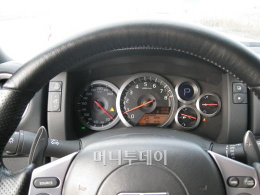 센터페시아 디스플레이 창에는 각종 오일류와 온도 등 차량 정보가 한눈에 볼 수 있도록 정리돼 있다. 센터페시아 하단부에는 기어변속비와 서스펜션, 차체자세제어장차(VDC)를 레이싱모드로 놓을 수 있는 버튼이 있다.