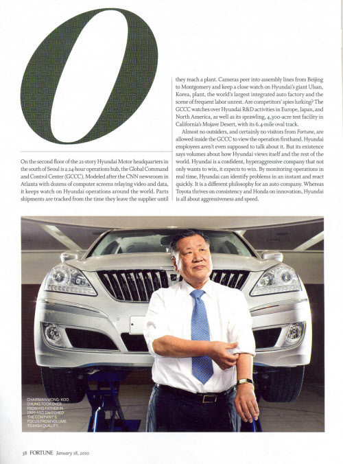 미국의 대표적인 경제전문지 '포춘'은 최근호에서 현대차를 '자동차 업계 최고 강자(The Toughest Car Company of Them All)'로 지칭하며 머릿기사로 보도했다. 특히 정몽구 회장의 품질경영과 공격적이면서도 신속한 의사결정 등 현대차 성공의 핵심 요인을 10페이지에 걸쳐 대대적으로 보도했다.