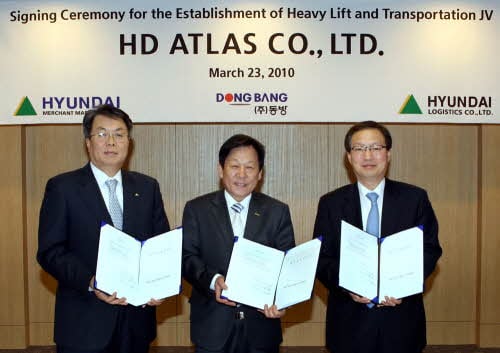 현대상선은 23일 국내 최고 중량화물 육상운송 업체인 (주)동방, 물류업체인 현대택배와 손잡고 합작법인 현대동방아틀라스(HD Atlas Co., Ltd.)를 설립했다고 밝혔다.