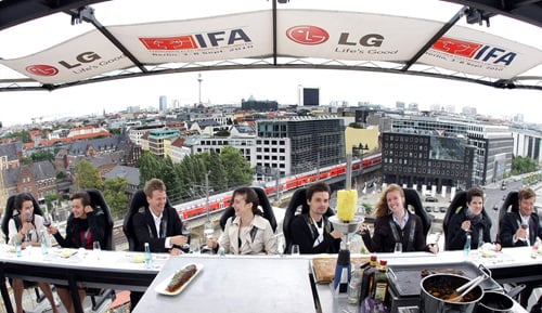 LG전자(121,400원 ▼6,500 -5.08%)가 유럽 최대 가전전시회인 'IFA 2010' 개막 하루 전인 2일(현지시각) 베를린 중앙역 상공위에서 'LG Something Better 레스토랑'을 설치, 독일 현지 고객들을 대상으로 'LG전자가 제공하는 하늘 위의 만찬'을 제공했다.