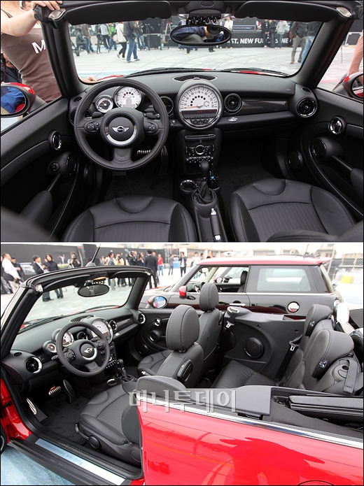 BMW 코리아가 13일 오전 서울 왕십리역 옥외주차장에서 '뉴 미니 패밀리' 신차 발표회를 갖고 있다. 사진은 운전자석과 실내 모습.