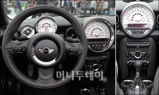 BMW 코리아가 13일 오전 서울 왕십리역 옥외주차장에서 '뉴 미니 패밀리' 신차 발표회를 갖고 있다. 사진은 핸들과, 중앙 콘솔.