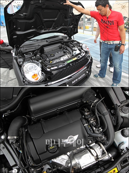 BMW 코리아가 13일 오전 서울 왕십리역 옥외주차장에서 '뉴 미니 패밀리' 신차 발표회를 갖고 있다. 사진은 밸브트로닉 기술이 적용된 1.6리터 4기통 가솔린 엔진.