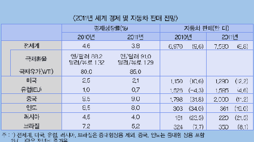 내년도 세계 자동차판매는 8.8% 증가한 7580만대로 예상했다. 세계 경제성장률이 올해 4.6%에서 내년 3.8%로 둔화될 것으로 전망되지만 중국과 인도, 브라질 등 신흥시장이 판매를 주도할 것으로 내다봤다.