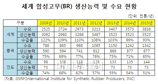 국제합성고무 연구기관인 IISRP가 집계한 통계에 따르면, 전 세계 합성고무(BR)의 올해 수요는 2973만톤, 생산능력은 3266만톤으로, 수급률은 110%다. 즉 생산능력이 수요를 10% 가량 웃도는 것이다.