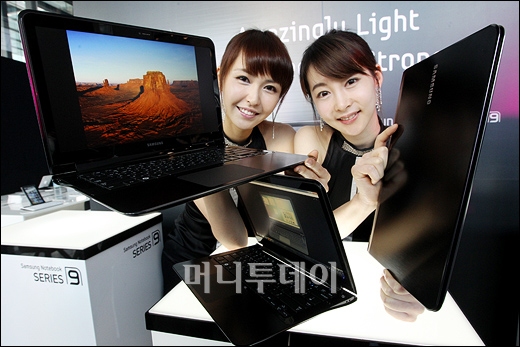 삼성전자가 24일 오전 서울 서초사옥 홍보관 딜라이트에서 초경량·초슬림 디자인 노트북 '센스 시리즈 9'을 출시하고 있다.